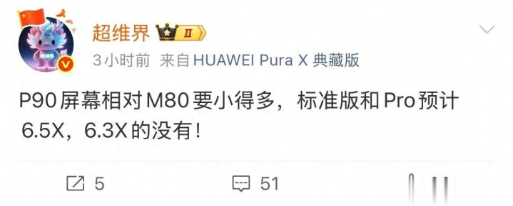 值得注意的是,爆料中提到P90屏幕相比M80要"小得多",这一表述需要结合具体产品定位来理解。如果M80指的是华为Mate 80系列,其标准版采用6.6英寸屏幕,Pro版为6.8英寸,那么P90系列若采用6.5X英寸规格,确实在尺寸上有所缩小。但需要明确的是,这里的"小得多"更多是相对概念,实际差异可能并不像字面描述那样显著。